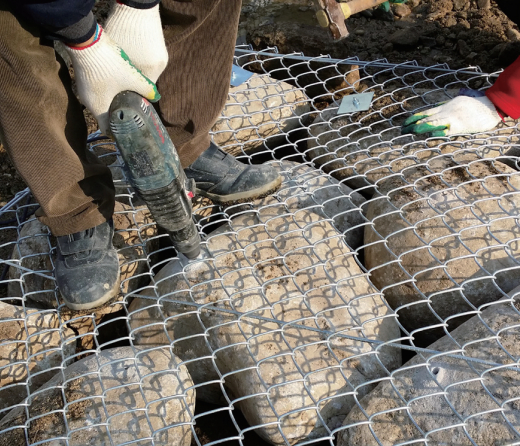자연석을 와이어 철선을 이용하여 상, 하, 좌, 우 일체형으로 조립하여 탈락 및 세굴방지, 침하를 방지할 수 있는 공법